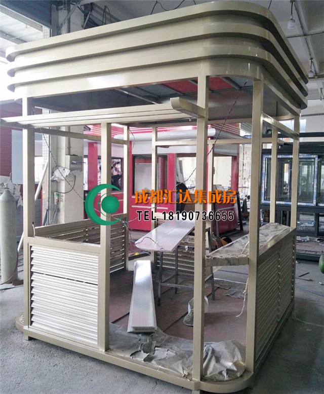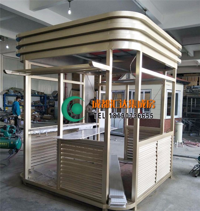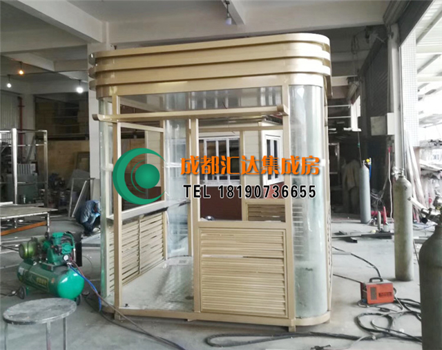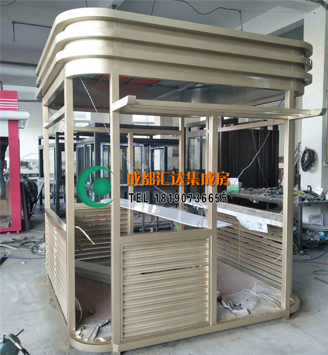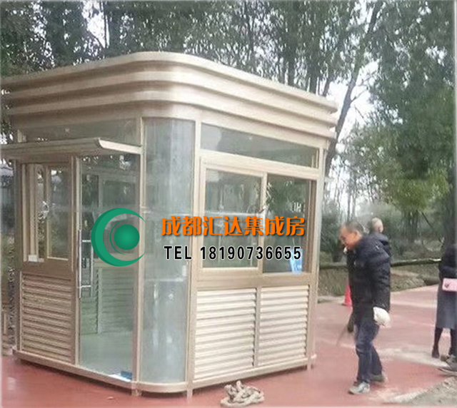 2017年11月,此款土豪金钢结构岗亭正式落户温江,玻璃采用双层玻璃,柱子采用的是氟碳喷漆材质,地板采用木地板,吊顶采用pvc吊顶,门有特别安全的锁。有安全的配点设施。